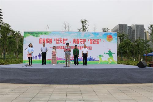 长沙县人大副主任曹艳萍在致辞中表示,希望团旗辉映“蓝天梦”,青春守护“星沙蓝”的活动,广泛动员长沙县的广大青少年,积极弘扬爱国、进步、民主、科学的“五四”精神,积极投身到长沙县打赢蓝天保卫战工作中来,协助开展水资源保护、污染防治宣传、生态环境治理、生态修复等工作,维护生态环境健康发展。与会领导为来自镇街、大中小学校、青年文明号、机关青年、青年社会组织等不同领域的10支“星沙蓝”志愿服务代表队队长进行现场授旗。团市委挂职副书记何平宣布“团旗辉映’蓝天梦’,青春守护’星沙蓝’”——长沙县青年助力蓝天保卫战志愿服务行动正式启动。