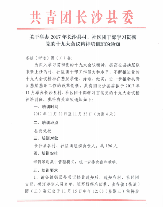 关于举办长沙县村、社区团干部学习贯彻党的十九大精神培训班的通知