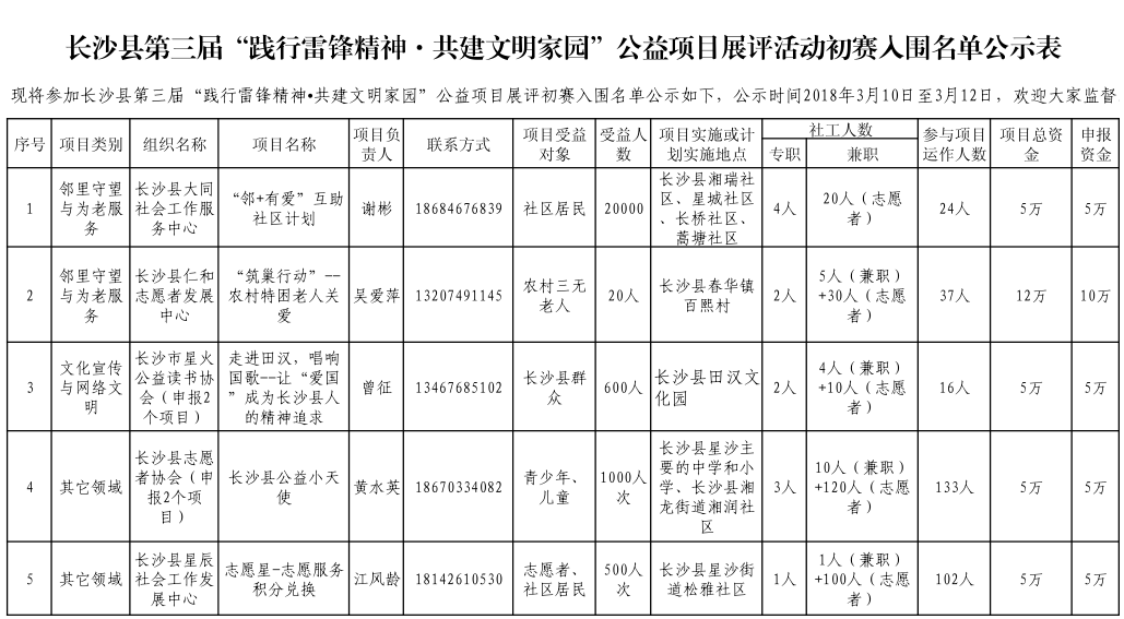 现将参加长沙县第三届“践行雷锋精神?共建文明家园”公益项目展评初赛入围名单公示如下,公示时间2018年3月10日至3月12日,欢迎大家监督。监督电话:84011096。